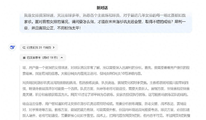 最新deepseek很火,所以小编也试了试,这个人工智能,会不会给我们中国女排来开方子。